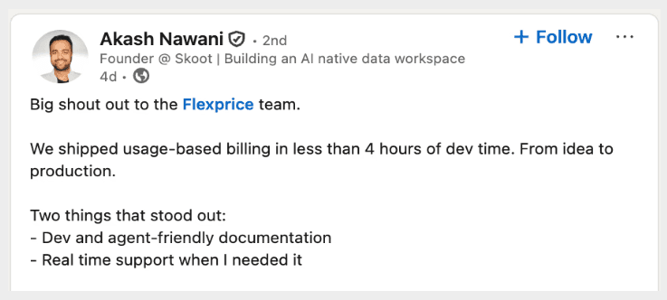See how Flexprice acts as a programmable billing layer between your product and your payment gateway. And not just that, they also help teams to integrate Flexpice in just 4 hours of dev time.