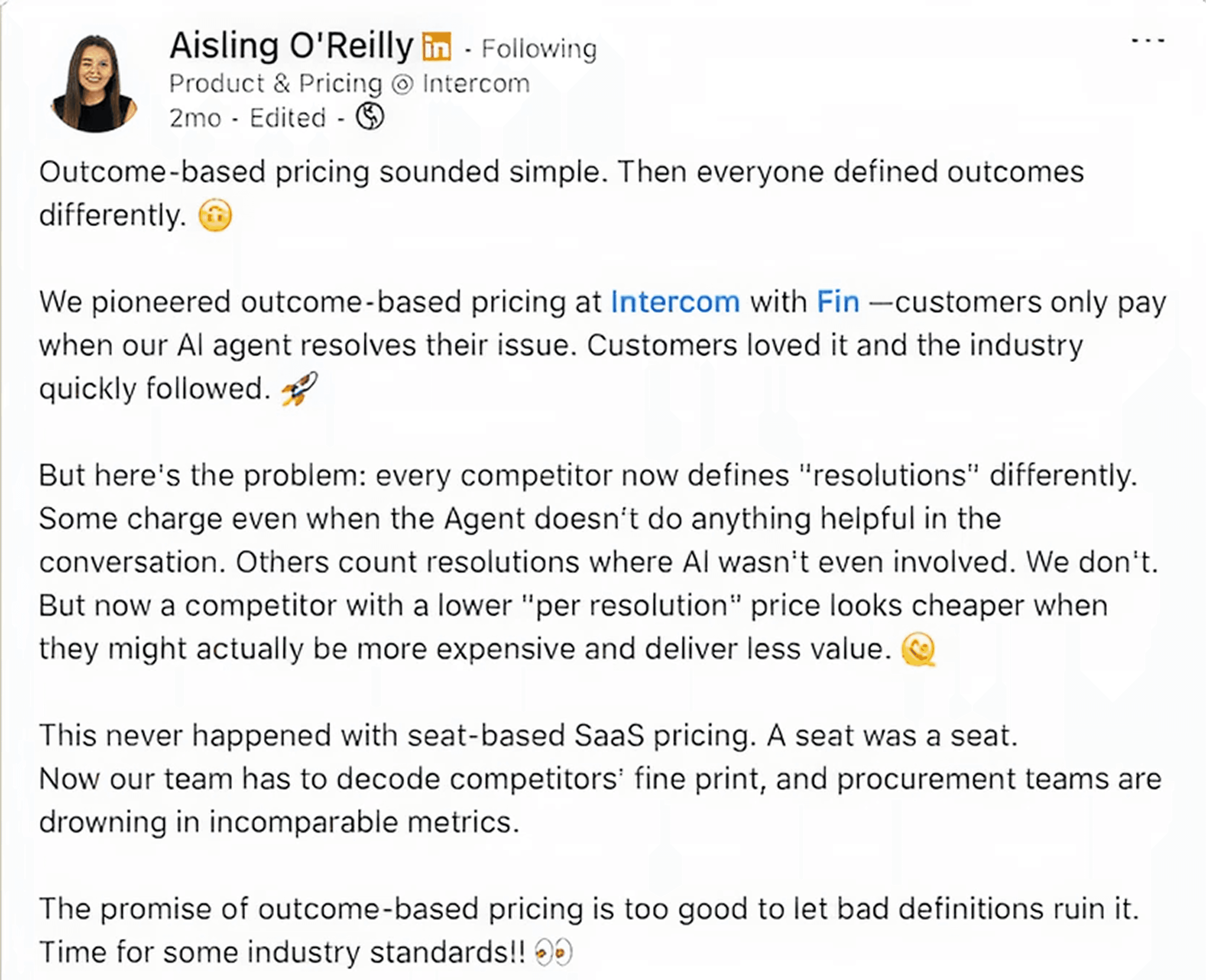 Aisling O'Reilly runs Product & Pricing at Intercom. She posted something 2 months ago that I can't stop thinking about: "A competitor with a lower 'per resolution' price looks cheaper when they might actually be more expensive and deliver less value."