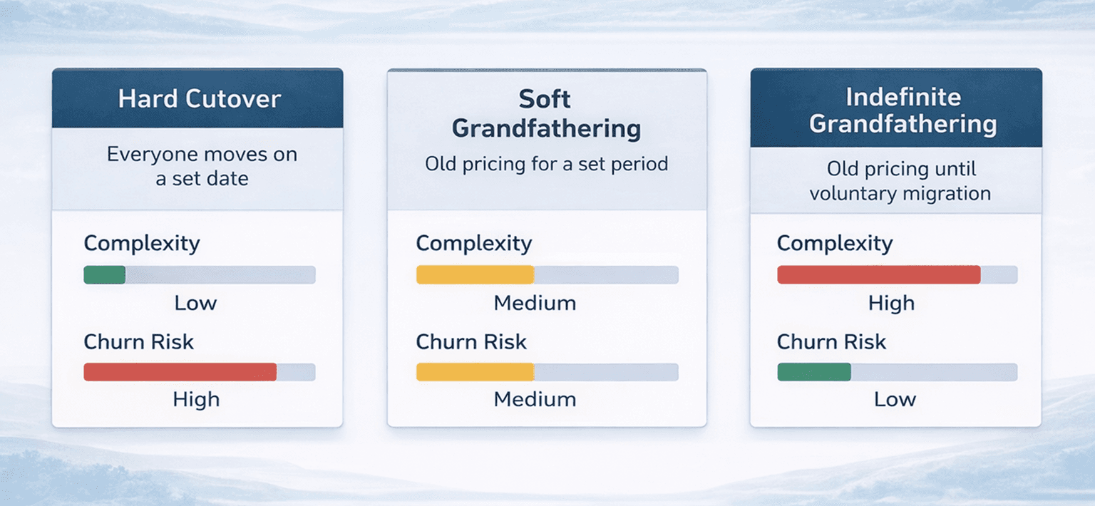 Existing customers keep their rate until they voluntarily migrate. This is the friendliest approach, but it means your billing system must maintain legacy pricing logic indefinitely. Two years later, your team is still debugging edge cases in a pricing model you stopped selling.